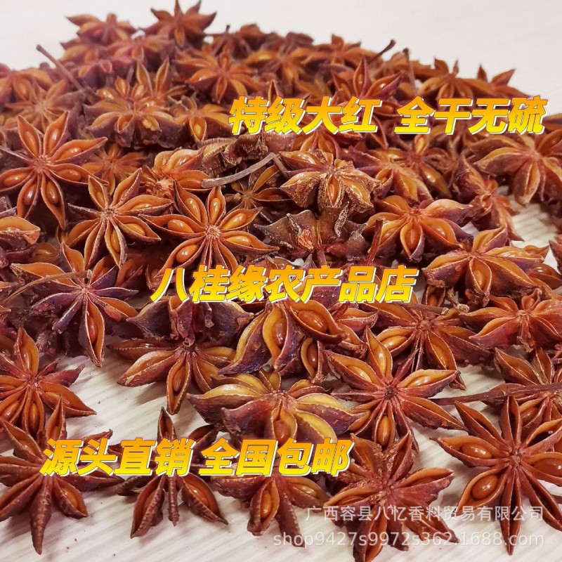 包装规格广西新货大红八角全干无硫过筛1斤,秋干枝八角全干过筛无黑果1斤,一级黄干枝碎片去梗去籽纯片1斤,八角粉1斤(梗打粉),八角粉1斤(大红碎片打粉)
